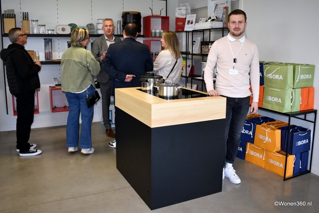 Colin Blezer (rechts) bracht het merk BORA voor het voetlicht. Op de achtergrond geeft Rabin Houben een rondleiding aan een viertal gasten.