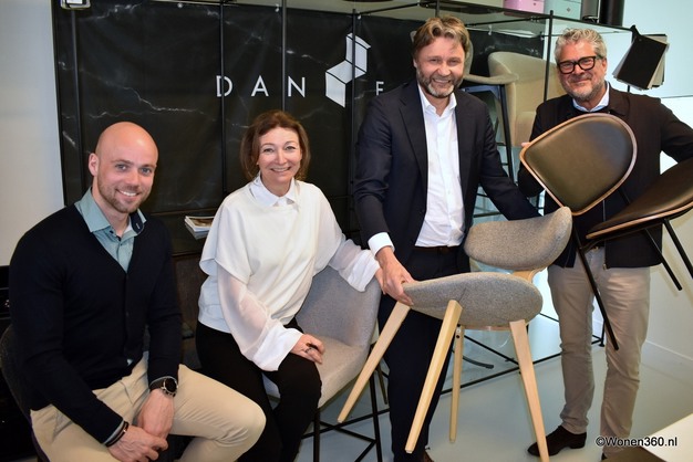 V.l.n.r. Jarno van de Velde, Martine van der Haegen, David Meymen en Mark Betten showen de nieuwste stoelencollectie van Dan Form uit Denemarken.