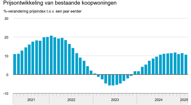In februari 2025 waren de prijzen van bestaande koopwoningen gemiddeld 10,6 procent hoger dan in februari 2024. Ten opzichte van januari 2025 bleven de prijzen in februari nagenoeg gelijk. De prijsontwikkelingen in dit bericht zijn gebaseerd op de prijsindex van bestaande particuliere koopwoningen in Nederland van het CBS en het Kadaster.