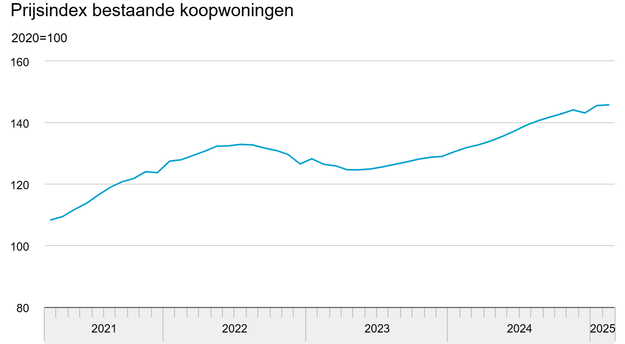 Ten opzichte van januari 2025 is de prijsindex bestaande koopwoningen in februari 2025 met 0,1 procent gestegen. De prijzen van bestaande koopwoningen bereikten in juli 2022 een piek. Daarna sloeg de trend om en daalde de prijsindex enige tijd. Sinds juni 2023 is de trend echter weer stijgend. In februari lagen de prijzen gemiddeld 9,6 procent hoger dan bij de vorige piek in juli 2022.