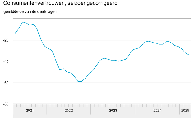 Het vertrouwen onder consumenten was in maart negatiever dan een maand eerder, meldt het CBS. Het consumentenvertrouwen kwam in maart uit op -34. In februari was dat -32. Vooral het oordeel over het economisch klimaat verslechterde. Aan het herstel van het consumentenvertrouwen, na het absolute dieptepunt in oktober 2022, kwam in de loop van 2024 een eind. Na september is het vertrouwen zes maanden op rij gedaald.