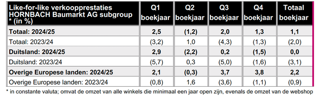 De geconsolideerde jaaromzet van de Hornbach Group steeg in het boekjaar 2024/25 met 0,6% naar een totaal van 6,2 miljard euro. Het betreft hier voorlopige cijfers die nog niet zijn geauditeerd. De totale omzet van de grootste operationele subgroep Hornbach Baumarkt AG kwam met 5.847 miljoen euro 1,2% hoger uit dan een jaar eerder. Het online omzetaandeel blijft een belangrijke pijler en maakte in het boekjaar 2024/25 12,3% (720 miljoen euro) uit van de totale omzet van Hornbach Baumarkt AG (2023/24: 12,7%).