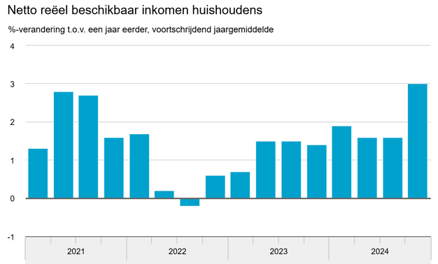 Het reëel beschikbaar inkomen van huishoudens is in 2024 met 3 procent gegroeid ten opzichte van een jaar eerder. De toename is vooral toe te schrijven aan een stijging van de beloning van werknemers, door hogere cao-lonen. De hypotheekschuld groeide met 35,6 miljard euro ten opzichte van een jaar eerder, naar 890,1 miljard euro. Dit meldt het CBS op basis van nieuwe cijfers over de financiën van huishoudens.