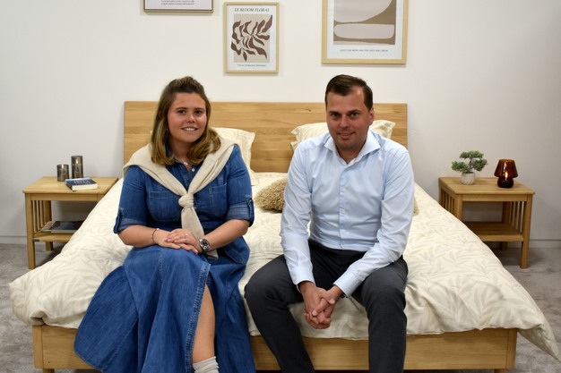 Ruben Viaene met zus Kaat, poserend op een 100% massieve eiken bed uit de collectie MAXX Furniture.