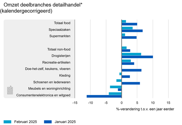De winkels in doe-het-zelfartikelen, inclusief keukens en vloeren (-0,1%), en de winkels in meubels en woninginrichting (-3,7%) hebben in februari minder omgezet, net zoals de kledingwinkels, de winkels in schoenen en lederwaren, en de winkels in consumentenelektronica. Daarentegen hebben de drogisterijen en de winkels in recreatieartikelen hebben in februari meer omgezet dan in februari 2024.