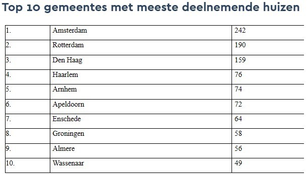 Tegenover het krappe woningaanbod staan veel woningzoekenden. Dat vertaalde zich - met het mooie lenteweer – door in iets meer bezoekers met gemiddeld 7 kijkers per woning. De bezoekersaantallen varieerden van een enkeling tot soms meer dan 75 kijkers. Ook de regionale spreiding van deelnemers is groot (zie kaart). Daarbij gaat het zeker niet 'vooral om kluswoningen'; tweederde (ca. 4.230) van de deelnemende woningen heeft een energielabel C of hoger en eenderde (ca. 2.140) zelfs met energielabel A of hoger. In de top 10 van gemeentes met meeste deelnemers staat Amsterdam bovenaan met 242 woningen (zie tabel).