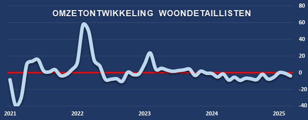 Woonwinkels (winkels in meubels, verlichtingsartikelen en artikelen voor woninginrichting met een algemeen assortiment) noteerden in februari een daling van de omzetwaarde van 3,7 procent ten opzichte van dezelfde periode een jaar eerder volgens het CBS. De omzetdaling werd veroorzaakt door zowel een lager prijsniveau als een lager verkoopvolume.