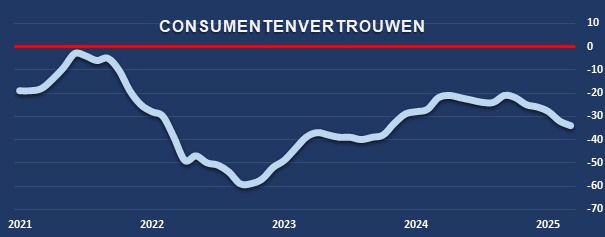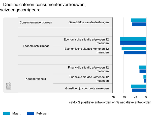 Het vertrouwen onder consumenten was in maart negatiever dan een maand eerder, aldus het CBS. Het consumentenvertrouwen kwam in maart uit op -34. In februari was dat -32. Aan het herstel van het consumentenvertrouwen, na het absolute dieptepunt in oktober 2022, kwam in de loop van 2024 een eind. Na september is het vertrouwen zes maanden op rij gedaald. Vooral het oordeel van consumenten over de economische situatie in de komende twaalf maanden verslechterde. Ook vonden consumenten de tijd voor het doen van grote aankopen ongunstiger dan in februari.