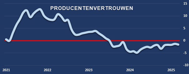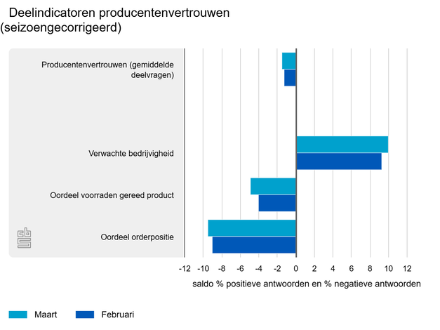 Dat komt doordat fabrikanten negatiever waren over de voorraden gereed product en de orderpositie. Ze waren echter positiever over de verwachte bedrijvigheid in de komende drie maanden. Een deelindicator was positief. Het aantal producenten dat verwacht dat hun productie de komende drie maanden zal toenemen was groter dan het aantal dat een afname van de productie voorziet. De andere twee deelindicatoren van het producentenvertrouwen waren negatief. Het aantal producenten dat de orderpositie groot acht, was kleiner dan het aantal dat de orderportefeuille klein vindt, gelet op de tijd van het jaar. Het aantal producenten dat de voorraad eindproduct als klein beschouwt, was kleiner dan het aantal dat de voorraden groot vindt.