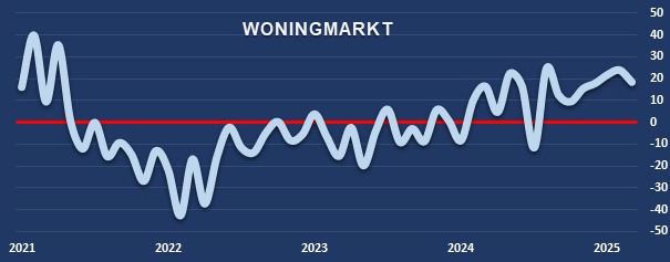 In februari 2025 zijn er volgens cijfers van het CBS en het Kadaster 16.356 bestaande koopwoningen verkocht. Dat is 18,4 procent meer dan in dezelfde periode een jaar eerder. Ten opzichte van de maand januari zijn er echter 8,7 procent minder bestaande koopwoningen verkocht in Nederland. De deelindicator van de woningmarkt is van 23,9 gedaald naar 18,4. Daarmee is de stand van de deelindicator over de woningmarkt, ondanks de daling, nog altijd veruit de meest positieve deelindicator van de woonbranche economische barometer.