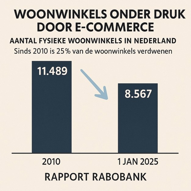 De woon- en interieurbranche staat al jaren onder druk door de snelle opmars van e-commerce. Uit een recent rapport van Rabobank blijkt dat sinds 2010 maar liefst 25% van de fysieke woonwinkels in Nederland is verdwenen. Waar het er in 2010 nog 11.489 waren, bleven er op 1 januari 2025 nog 8.567 over. Een duidelijke indicatie van de verschuivende winkelgewoonten van de Nederlandse consument.