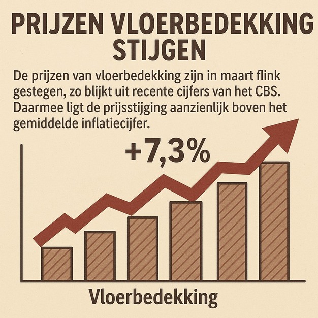 De prijzen van vloerbedekking zijn in maart flink gestegen, zo blijkt uit recente cijfers van het Centraal Bureau voor de Statistiek (CBS). De bestedingscategorie 'vloerbedekking', waaronder onder andere tapijten, linoleum en vaste vloeren vallen, was maar liefst 7,3 procent duurder dan in maart vorig jaar. Daarmee ligt de prijsstijging aanzienlijk boven het gemiddelde inflatiecijfer.