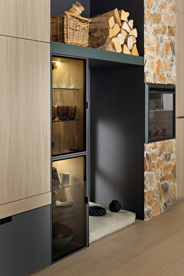 De gefreesde Silona-fronten vormen het decoratieve hart van het interieur. Ze omkaderen de haard op moderne wijze en geven het geheel karakter met hun hedendaagse reliëfstructuur. Ze zijn gemaakt van gerecycleerd PET en dragen bij aan de duurzame filosofie van Mobalpa.