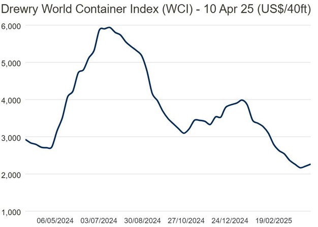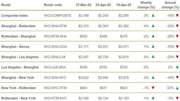 De wereldwijde containertarieven zijn afgelopen week met 3% gestegen, zo blijkt uit de nieuwste cijfers van de World Container Index (WCI) van Drewry, een wekelijkse index die de gemiddelde spotprijzen weergeeft voor het vervoer van een 40-voets container op belangrijke mondiale zeevaartroutes. Het tarief voor een standaard 40-voet container kwam daarmee uit op $2.265.