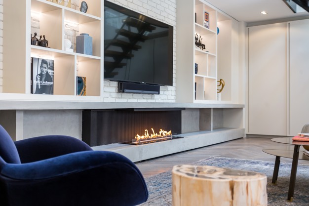 Bio-haard met maatwerk wandmeubel, ontworpen in samenwerking met een architect. Beton, metaal en hout vormen de basis van deze sfeervolle wandvulling. Ook andere brandstoffen, materialen en vormen zijn mogelijk.