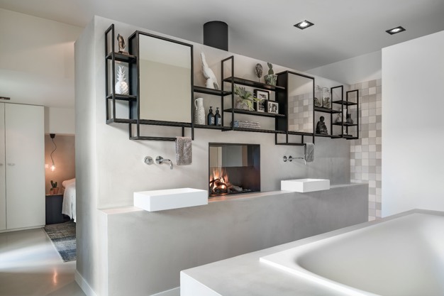 Doorkijkhaard met maatwerk stalen meubel en spiegelcommode, geplaatst tussen slaapkamer en badkamer. De haard is geschikt voor hout, gas, bio-ethanol of waterdamp.