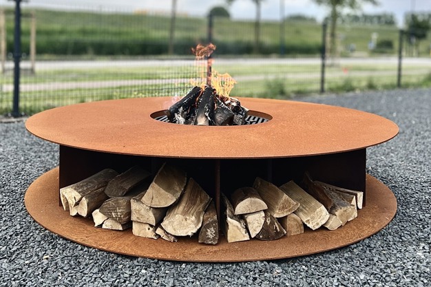 Monumentale vuurplaats in massief Cor-Ten staal, met geïntegreerde BBQ-functie. Duurzaam, sfeervol en volledig op maat gemaakt – perfect voor lange zomeravonden én winterse buitenmomenten.
