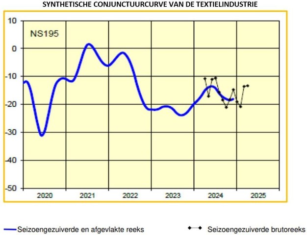 De conjunctuurcurve van de textielindustrie die het ondernemersvertrouwen weergeeft en 3 maanden voorloopt op de werkelijke activiteit, kende in het eerste kwartaal van 2025 een vrij gunstig verloop, alhoewel er nog steeds meer bedrijfsleiders negatief gestemd zijn over de toekomstige economische evolutie dan er bedrijfsleiders positief gestemd zijn.