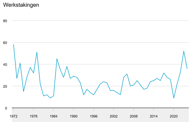 In 2024 waren er 36 werkstakingen, dat zijn 16 stakingen minder dan in 2023. Bij deze stakingen waren 21 duizend werknemers betrokken. In de industrie werd het meest gestaakt. Dit meldt het CBS op basis van nieuwe cijfers. In 2020, het eerste coronajaar, vonden er slechts 9 werkstakingen plaats. Sindsdien nam het aantal elk jaar toe, tot 52 stakingen in 2023. In 2024 nam het aantal stakingen voor het eerst weer af.