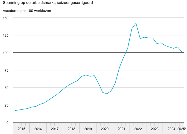 Het aantal vacatures nam in het eerste kwartaal af met 7 duizend terwijl het aantal werklozen met 16 duizend toenam. De arbeidsmarkt werd hierdoor minder krap. Voor elke 100 werklozen waren er 101 openstaande vacatures. Het aantal banen daalde voor het eerst in ruim 4 jaar licht (-14 duizend). Dat blijkt uit nieuwe cijfers van het CBS.