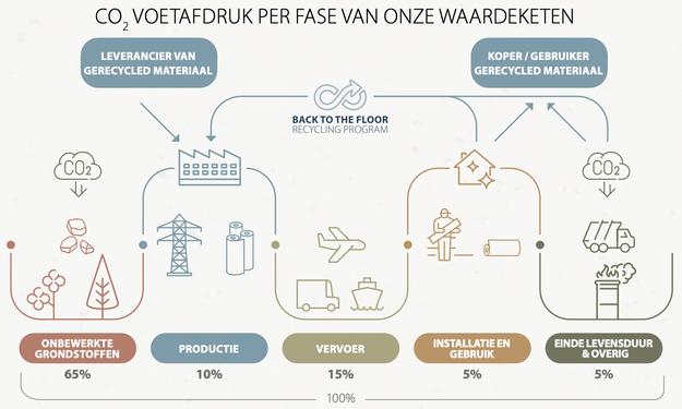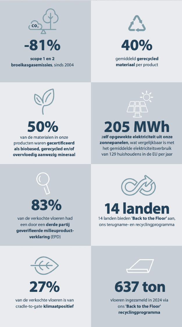 Duurzaamheid gaat verder dan alleen het productieproces. Ook aan het einde van de levensduur van vloeren is het belangrijk om verantwoordelijkheid te nemen. Via het terugnameprogramma 'Back to the Floor' werd in 2024 maar liefst 637 ton vloerafval ingezameld uit 14 landen. Van dit afval werd 88 procent hergebruikt of gerecycled, waarvan 35 procent direct werd verwerkt in nieuwe vloerproducten. Ook verpakkingsmateriaal en installatieafval worden actief teruggenomen en opnieuw verwerkt.