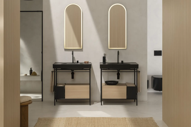 Meridian roept sereniteit en tijdloze elegantie op en omarmt tegelijkertijd innovatie en hedendaags leven", aldus het bedrijf. Aanpasbaarheid staat centraal in de collectie, die oplossingen biedt variërend van compacte eenheden tot dubbele wastafelmeubels, modulaire rekken en keramische toiletten en bidets in wit, mat wit en mat zwart. De ingetogen luxe van Meridian is geschikt voor zowel woon- als horecaomgevingen.