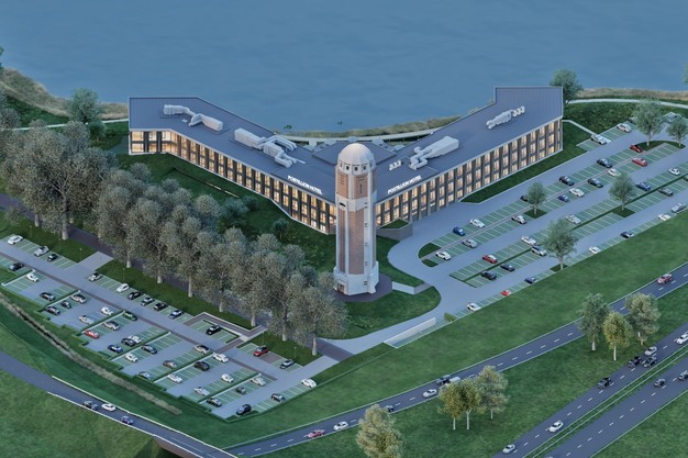 De watertoren, 44 meter hoog, komt straks direct aan het water te liggen, omgeven door de natuur van de Biesbosch. Het hotel krijgt 150 kamers en meer dan 4000 m² aan congres, vergader- en restaurantfaciliteiten, verdeeld over drie verdiepingen. Inclusief een terras van 650 m² én een skybar in de toren met spectaculair 360 graden uitzicht over de regio.