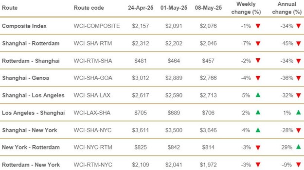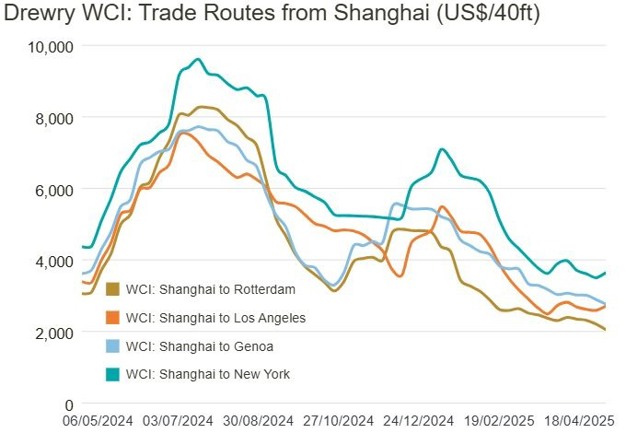 De grootste prijsdalingen deze week werden genoteerd op de route Shanghai–Rotterdam, waar de tarieven met 7 procent ofwel 156 dollar daalden naar 2.046 dollar per container. Ook op de route Shanghai–Genua zakten de prijzen met 4 procent naar 2.766 dollar. Tussen New York en Rotterdam daalde het tarief met 3 procent tot 814 dollar, terwijl de retourroute naar New York eveneens met 3 procent daalde tot 1.972 dollar.