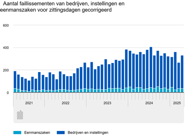In april zijn, voor zittingsdagen gecorrigeerd, 331 bedrijven failliet verklaard, meldt het CBS. Dat zijn 31 minder faillissementen dan in dezelfde maand een jaar eerder, ofwel een daling van 9 procent. Ten opzichte van maart is het aantal faillissementen gestegen met 23 procent.