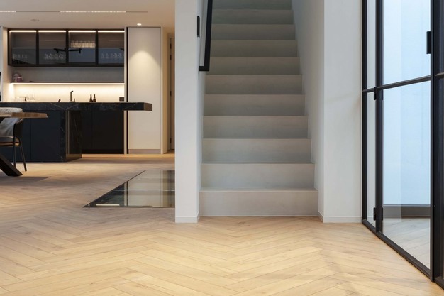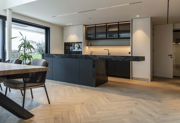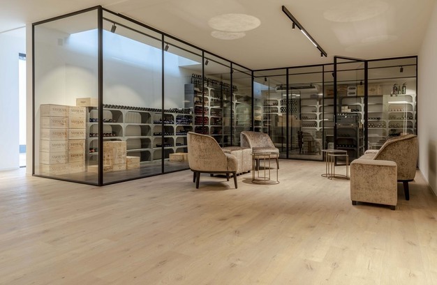 "We kozen voor drie verschillende stijlen: lange planken, visgraat en tegels – allemaal van Coretec. In de woonkamer legden we visgraat en integreerden we ook een glazen luik die binnenkijkt in de wijncollectie op de benedenverdieping. Want die verdiende zijn eigen ruimte. In de wijnkelder kozen we voor een tegel, omdat die wat krachtiger toont en zorgt voor een mooie afscheiding met de rest van de benedenverdieping. Naast die wijncollectie creëerden we dan een zithoek om vrienden en familie te ontvangen. Daar kozen we dan voor planken zodat de aandacht naar de wijncollectie gaat. Ook hier heeft het onderhoudsgemak van Coretec zich bewezen", zegt Barbara lachend. "Voor wijnvlekken op onze vloer hebben we geen schrik meer."
