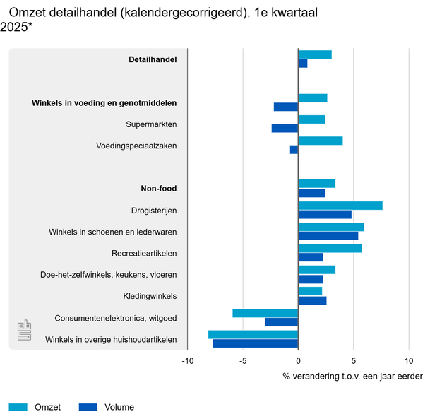 De detailhandel zette in het eerste kwartaal van 2025 3,1 procent meer om dan in dezelfde periode een jaar eerder. Het verkoopvolume was 0,9 procent groter. Er gingen in de eerste drie maanden van 2025 minder detailhandelaren failliet dan in dezelfde periode in het jaar ervoor. Dit meldt het CBS op basis van nieuwe kwartaalcijfers over de detailhandel.