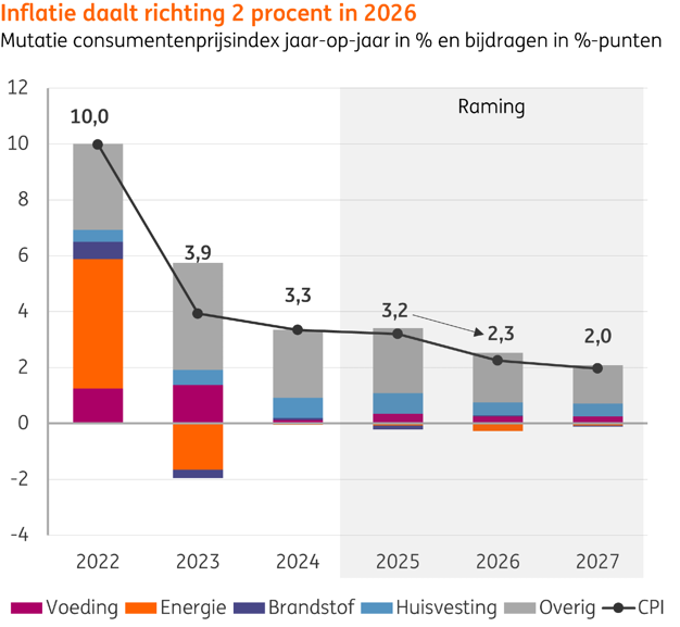 De consumentenprijzen zullen minder hard stijgen dan eerder gedacht. Vooral voor 2026 raamt ING Research dat de inflatie lager zal uitkomen dan een paar maanden geleden verwacht werd. Dit komt door een somberder beeld van de wereldeconomie en beleidswijzigingen van het kabinet. Omdat naast inflatiedrukkende maatregelen ook belastingverhogingen zijn aangekondigd, zal de totale koopkrachtwinst van de Voorjaarsbesluitvorming veelal veel kleiner uitpakken dan de lagere inflatie suggereert. Wel kunnen er aanzienlijke verschillen tussen verschillende typen huishoudens optreden.