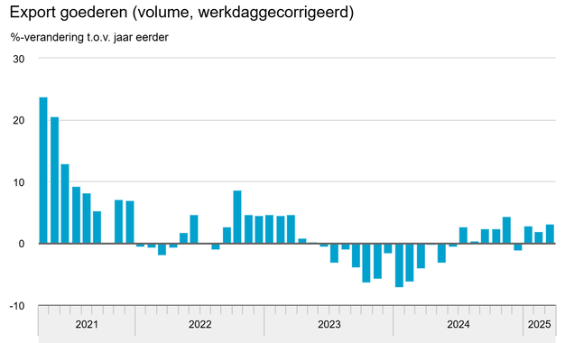 Het volume (werkdaggecorrigeerd) van de goederenexport was in maart 3,2 procent groter dan in maart 2024, meldt het CBS. Dat komt vooral doordat de uitvoer van machines, chemische producten en voedings- en genotmiddelen hoger was. Het volume van de goederenimport was in maart 2,1 procent groter dan in maart 2024. Er zijn vooral meer chemische producten, elektrotechnische en optische apparaten, machines, transportmiddelen en voedings- en genotmiddelen ingevoerd.