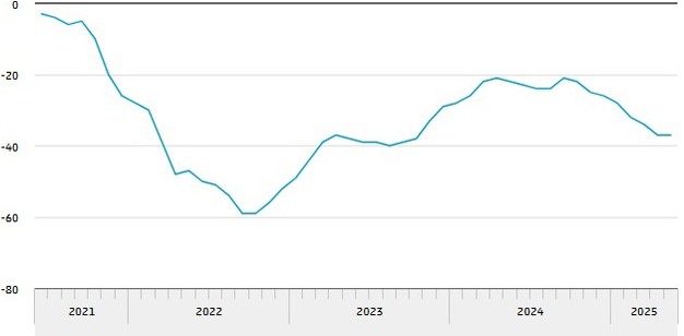 Het consumentenvertrouwen in Nederland is in mei 2025 stabiel gebleven op -37, hetzelfde niveau als in april. Dit blijkt uit recente cijfers van het Centraal Bureau voor de Statistiek (CBS). Daarmee blijft het vertrouwen aanzienlijk onder het twintigjarig gemiddelde van -10. Sinds het dieptepunt van -59 in september en oktober 2022 was er enige verbetering zichtbaar, maar die ontwikkeling is sinds het najaar van 2024 tot stilstand gekomen.