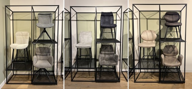 Natuurlijk mogen de stoelen niet overgeslagen worden. Maxfurn presenteert deze huisshow drie nieuwe stoelenfamilies: Jamaica, Jefferson en Argentina. Elke familie bestaat uit een eetkamerstoel, een armstoel en een barstoel, allemaal gebaseerd op dezelfde basisvorm. Zo is het mogelijk om op verschillende plekken in de woning een herkenbare stijl door te voeren, terwijl het toch afwisselt in functie en uitvoering. Ook hierbij is er keuze uit diverse stofkleuren, waardoor elke combinatie nauwkeurig kan worden afgestemd op de gewenste woonstijl.