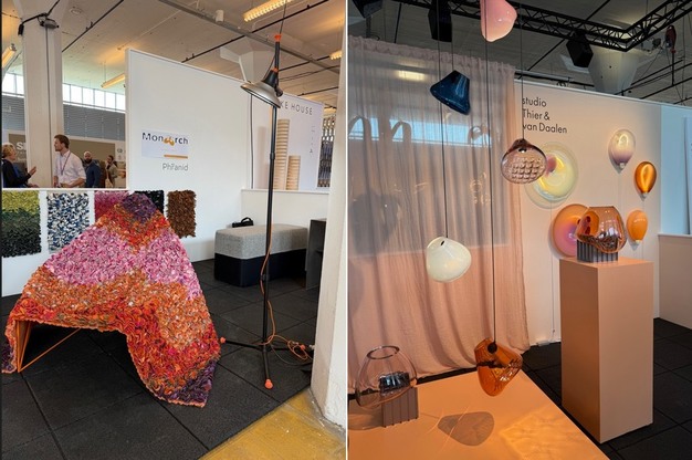 Links de Monarch stoel, die tot stand is gekomen tussen een samenwerking met huqrugs en Phranid. Rechts de nieuwe exposant Studio Thier & van Daalen, die de GRID lamp presenteerden.