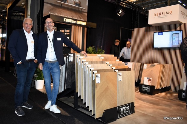 Henk Teraa en Rob Pfundt bij de vloerencollectie van COREtec tijdens InCoDa 2024.