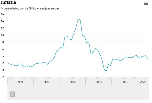 Bij de snelle raming was de inflatie in mei 3,3 procent, meldt het CBS. Deze raming is berekend op basis van nog onvolledige brongegevens. In april was de inflatie 4,1 procent.