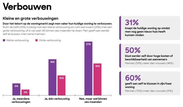 Door het huidige woningtekort kiest 31% van de Nederlanders ervoor om hun bestaande woning op te knappen. Dit leidt tot een groeiend aantal grote en kleine verbouwingen. Kostenbesparing speelt hierbij een belangrijke rol: steeds meer mensen steken zelf de handen uit de mouwen om te klussen. Dit geldt voor zowel mannen (70%) als vrouwen (51%), wat zorgt voor een sterke behoefte aan inspiratie rondom klussen en DIY-projecten (Do It Yourself).