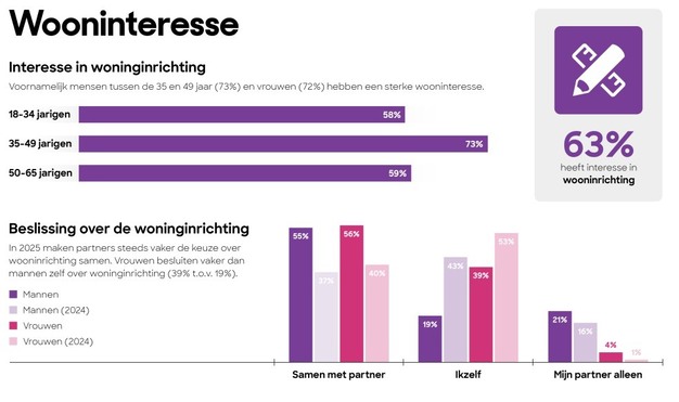 Wooninrichting is steeds vaker een gezamenlijke keuze binnen een huishouden. Uit onderzoek blijkt dat 55% van de samenwonende partners in 2025 gezamenlijk beslissingen neemt, waar dat in 2024 nog om 39% ging. Loyaliteit aan woonmerken groeit en uit ons onderzoek blijkt dat vooral mannen loyaal zijn aan woonmerken. Tegelijkertijd staan zowel mannen (67%) als vrouwen (73%) nog steeds open voor nieuwe woonmerken.