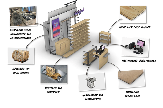 Porcelijn merkt dat zijn aanpak begint te landen. Een goed voorbeeld is zijn langdurige samenwerking met NS Retail, voor wie hij al jaren winkelinterieurs helpt verduurzamen. "Toen de NS besloot dat verbouwingen minimaal 50% CO₂-reductie moesten opleveren, kreeg ik de ruimte om dat circulair aan te pakken. Inmiddels ontwikkelen we bouwprincipes waarbij we voor verbouwingen van winkels zoveel mogelijk onderdelen hergebruiken, van stellingen tot prijskaartjes, zonder dat het er oud uitziet. Dat is het mooie: je maakt iets wat als nieuw voelt, maar met de ziel van het oude. De basis is hierbij vaak onopvallend en demontabel zodat we deze telkens opnieuw in standaard onderdelen kunnen hergebruiken, terwijl de opvallende dingen van recycled grondstoffen zijn: uniek en nieuw gemaakt met een extreem lage impact."