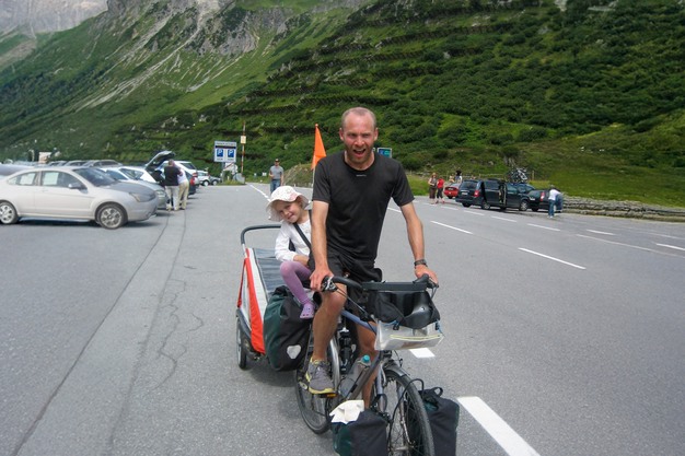 Rick Porcelijn tijdens zijn fietstocht van Amsterdam naar Rome met een van zijn twee kinderen.