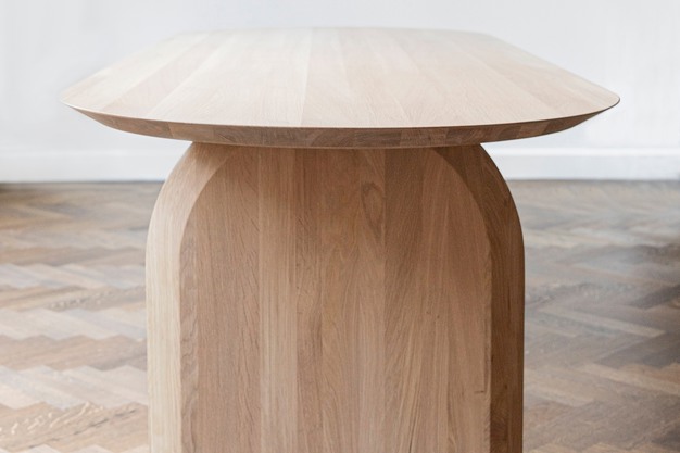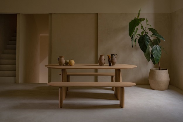 De vernieuwde Slot is er in massief eiken- of notenhout en behoudt de karakteristieke combinatie van geometrie en zachte lijnen die het ontwerp tot een moderne klassieker maken. Nieuw is de beschikbaarheid van een donkerbruine hardwax olie-afwerking, die de tafel een warme, natuurlijke uitstraling geeft. Deze afwerking wordt ook voor andere houten meubels uit de collectie beschikbaar.