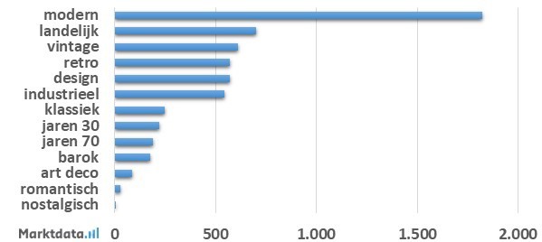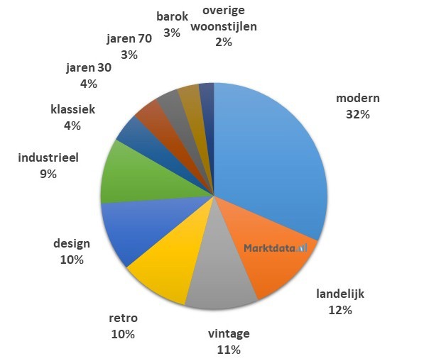 32 Procent van het zoekvolume met woonstijl aanduiding heeft betrekking op de moderne woonstijl. Op de tweede plaats staat de landelijke woonstijl met een aandeel van 12 procent in het zoekvolume. De nummer drie is de vintage woonstijl, die 11 procent van het zoekvolume vertegenwoordigt.