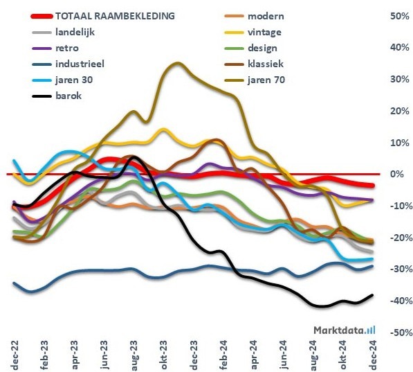 Uit het figuur blijkt dat de groei van het aantal zoekopdrachten naar raambekleding van specifieke woonstijlen globaal een gelijke trend doormaakt ten opzichte van het totaal aan raambekleding gerelateerde zoekopdrachten. Een uitzondering hierop is de jaren 70 woonstijl die met name tot begin 2024 sterk boven gemiddeld is gegroeid.