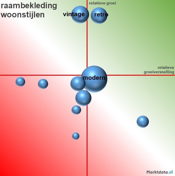 De woonstijlen vintage en retro kennen op afstand de sterkste relatieve groei. Met name de woonstijlen barok en jaren 30 bevinden zich in een ongunstig kwadrant als het gaat om de verwachte ontwikkeling van woonstijlen in relatie tot raambekleding. Alle volledige cijfers en omschrijvingen kun je nalezen in de Raambekleding Marktmonitor 2024 van Marktdata.nl