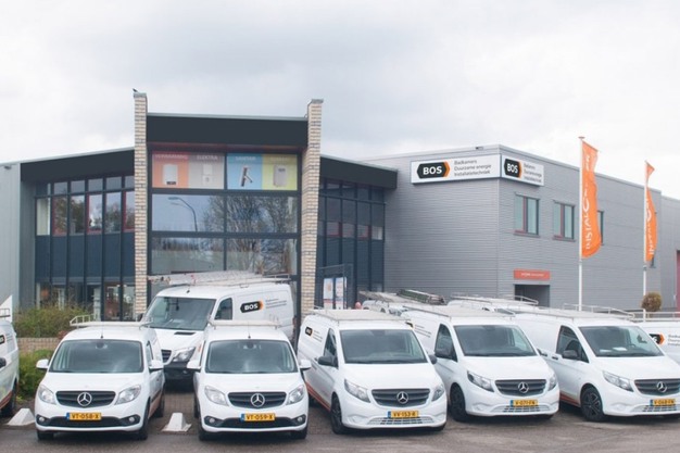 Het pand van Bos Installatietechniek met de bedrijfswagens.
