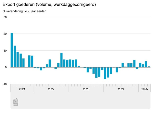 Het volume (werkdaggecorrigeerd) van de goederenexport was in april 0,5 procent groter dan in april 2024, meldt het CBS. Dat komt vooral doordat de uitvoer van machines en voedings- en genotmiddelen hoger was. Het volume van de goederenimport was in april ook 0,5 procent groter dan in april 2024. Er zijn vooral meer machines, elektrotechnische machines en voedings- en genotmiddelen ingevoerd.
