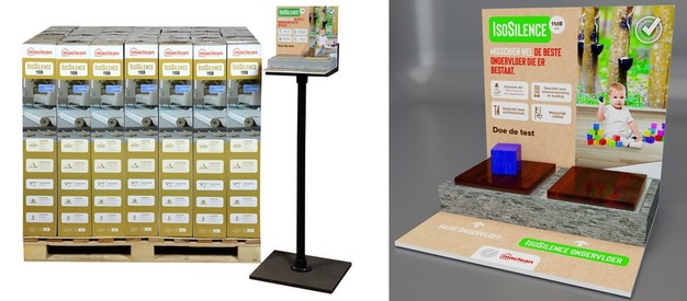Een pallet IsoSilence met tester. Rechts een display-render van hetzelfde merk.