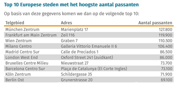 Naast München en Frankfurt staan steden als Wenen, Milaan en Madrid in de top 10. Brussel behaalt plek 7 met Nieuwstraat, waar 73.700 passanten werden geteld. Amsterdam haalt de top 10 niet en staat op positie 19, na onder andere Parijs en Hamburg.